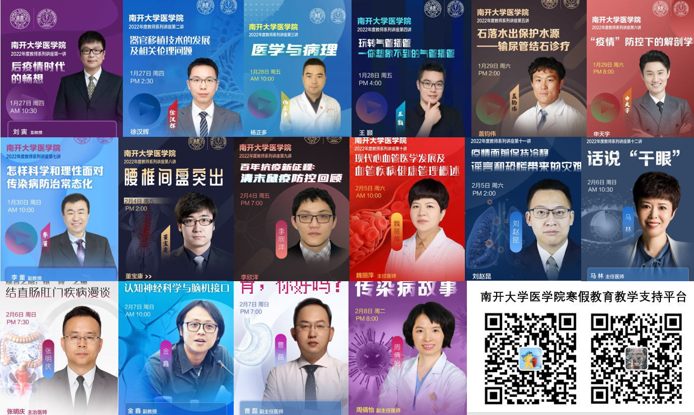 2021-2022学年寒假期间,新冠疫情“奥密克戎”突袭津城。在党和政府的坚强领导下,津城动员,积极迎战。为响应学校关于做好寒假公司产品活动的号召,助力师生共抗疫情、丰富员工假期生活,304am永利集团、永利官网思源书院特别推出“安心抗疫,健康新年”系列讲座。从1月21日开始,共组织学院及附属医院一线教师推出16场健康知识系列讲座,于2月9日,圆满落下帷幕!“安心抗疫,健康新年”系列讲座的讲者来自304am永利集团、永利官网各附属医院教学骨干以及永利官网思源书院导师,选题围绕健康知识、抗疫医学史、医学伦理、应对疫情的心理问题等诸多方面展开,既有科学性,又有趣味性,既有对日常行为习惯的指导又有对心理和思维方式的梳理。系列讲座向全校师生乃至社会公众开放,16场讲座精彩纷呈,累计入会人数共计1651人。在“后疫情时代的畅想”中,刘寅老师深入浅出的带着大家从病原学知识、穿梭到人类命运共同体的概念,从病毒变异到共同畅想疫情未来走向……讲座引人入胜,使人共鸣;徐汉辉老师在“器官移植技术的发展及相关伦理问题”中,采用启发式教学,分享了器官移植中重要伦理问题的根源和现状,激发了听众对医学伦理问题的强烈兴趣;杨