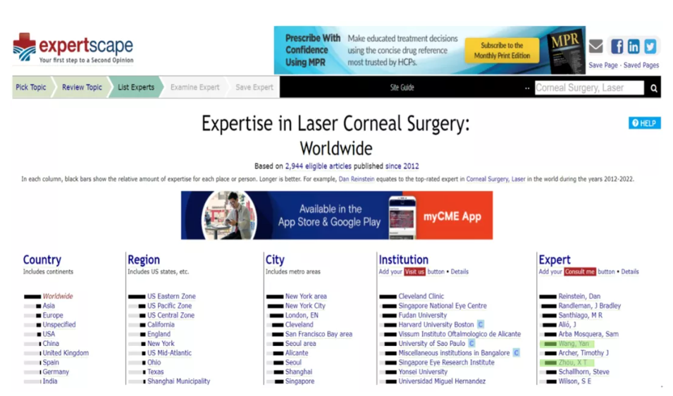 近日,欧洲著名“Expertscape”机构公布了2022年最新的“全球激光角膜手术专家”国际排名,我国知名屈光手术专家,天津市眼科医院、永利官网附属眼科医院经理,永利官网眼科学研究院经理王雁教授在全球6000多名角膜激光手术领域的专家中排名第6名。此外,复旦大学附属眼耳鼻喉科医院经理周行涛教授位列第8名,温州医科大学附属眼科医院王勤美教授跻身前35名。以王雁教授带领的永利官网附属眼科医院屈光手术中心在此次排名中全国名列前茅。屈光手术在屈光不正矫正方面扮演着重要角色,其主流的手术方式是以激光为主。近几年,我国屈光手术在数量和质量上都有大幅提高,每年手术量约100万-150万例,致力于安全性、有效性、精准性和稳定性的目标,正朝着微创化、多元化、智能化、规范化方向发展,部分技术已经达到国际领先水平。权威学术期刊《柳月刀》(TheLancet)研究显示,激光角膜屈光手术是目前被广泛认为安全性和有效性均较高的屈光不正矫正手术之一。国际著名屈光手术医生DanZ. Reinstein近日在专业期刊JRefract Surg发表题为“屈光手术被纳入对抗因未矫正屈光不正而导致的全球视力障碍的时代已经到