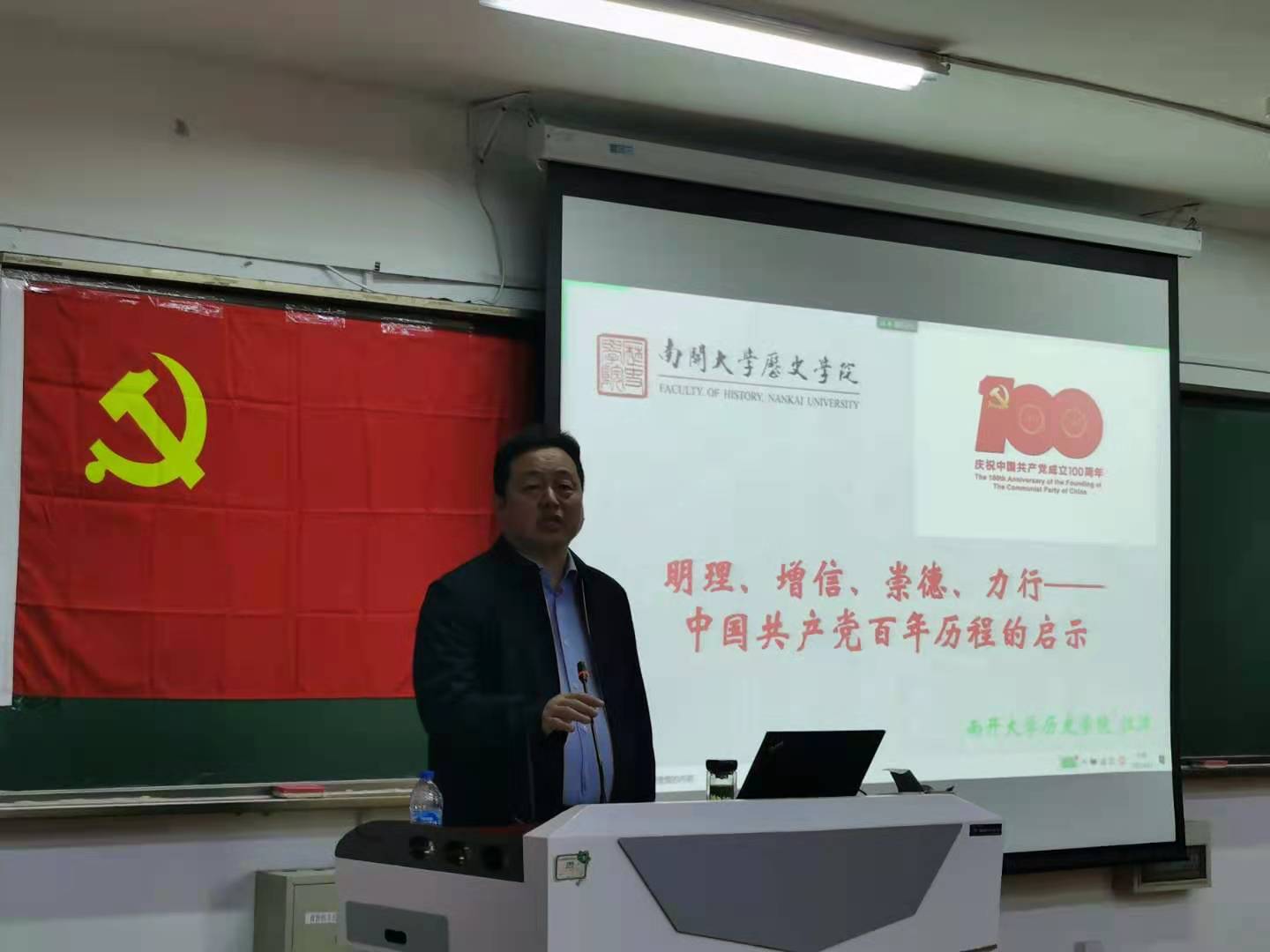 江沛教授以百年党史中若干生动的历史事件和英雄人物为依据,对党史教育的核心概念“学史明理、学史增信、学史崇德、学史力行”进行了深入解析,深刻阐释了中国共产党百年奋斗历程中的艰苦卓绝、奋发图强和丰功伟绩,使广大师生党员进一步明确了中国共产党领导核心地位的合法性、权威性和必然性正是源于历史的选择、人民的选择和时代的选择,从而进一步增强了在党的领导下凝心聚力,真抓实干,为实现中华民族伟大复兴的中国梦而努力的信心和决心。
