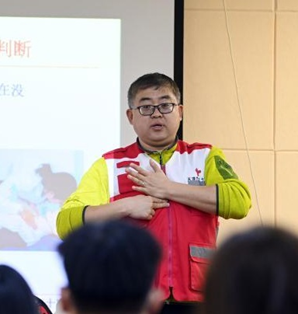 讲座上,潘森队长结合多年救援经验阐释了应急救护的内涵,分享了他多年从事红十字急救培训和救援工作的感悟与心得。